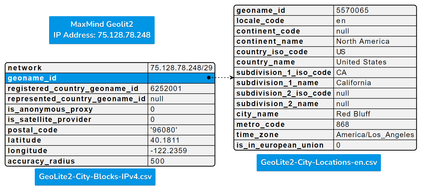 Even though CSV datasets are flat tabular, MaxMind’s nested data structure philosophy still holds true. That is why their Geolite2/GeoIP CSV database comes with two databases: