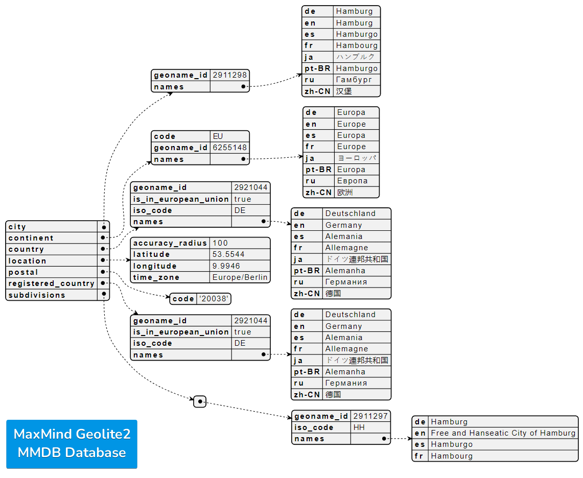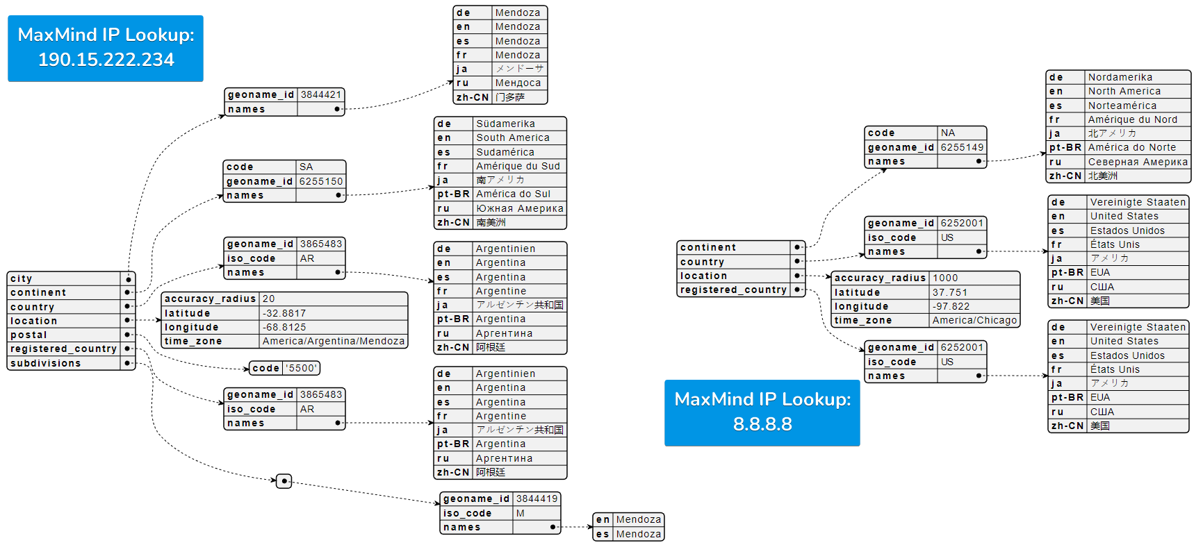 As we have seen, MaxMind prefers a nested data structure for its IP geolocation database, which includes translations and location data. When choosing to migrate to IPinfo you should remember to switch the dictionary key and index sequences for looking up values.