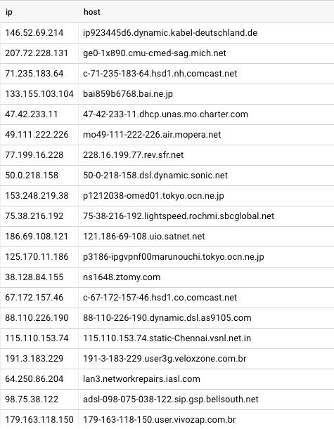 To get hostnames we clearly need to resolve the IP address to a name at some point. We started by resolving all IP addresses to their hostnames in bulk. The resulting data set was just over 50GB, and looked like this: