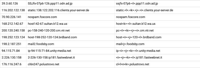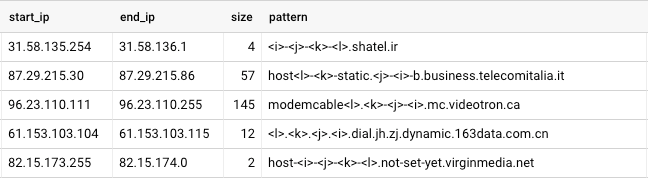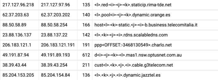 We spent a lot of time analyzing the hostname data and looking for patterns like the one above. There are some obvious ones, like the IP address being included in the hostname, or a reversed copy of the IP address in the hostname. There are also some less obvious ones, like a hexadecimal version of the IP in the hostname, or an offset number being included in the hostname.