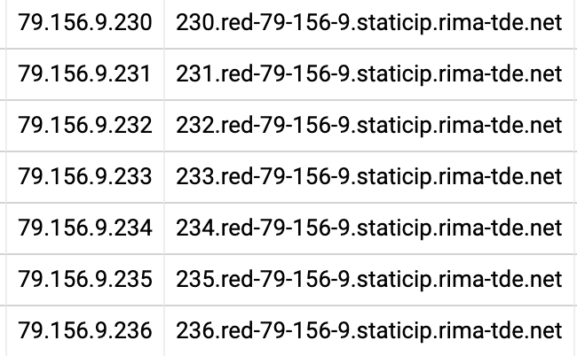 For example, all of those IP addresses (and many more on the same ISP) have a common string in their hostname (red-79–156–9.staticip.rima-tde.net), prefixed with the last octet of the IP address. We can replace all of those records with a single record that looks something like this: 79.156.0.230–236: $lastoctet.red-79–156–9.staticip.rima-tde.net