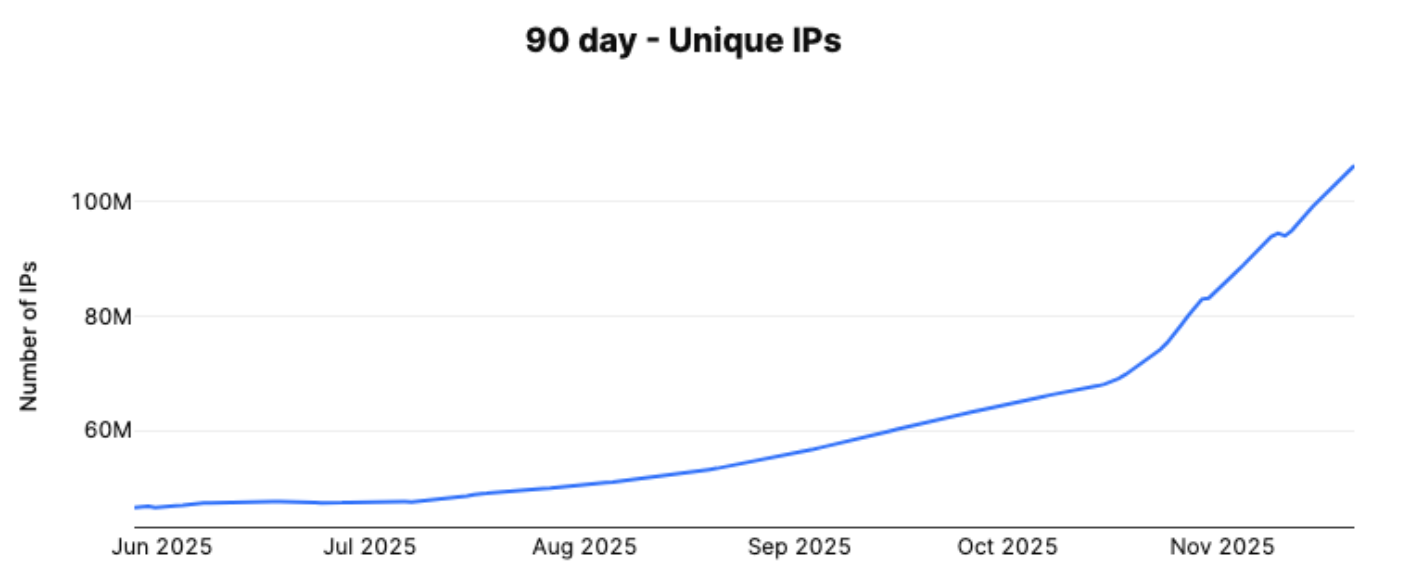 Sign up for freeSince launching our residential proxy detection data in January 2025, our coverage has grown from 20 million to over 100 million unique IP addresses. That means stronger detection of fraudulent traffic, verification of ad impressions, and protection of content.