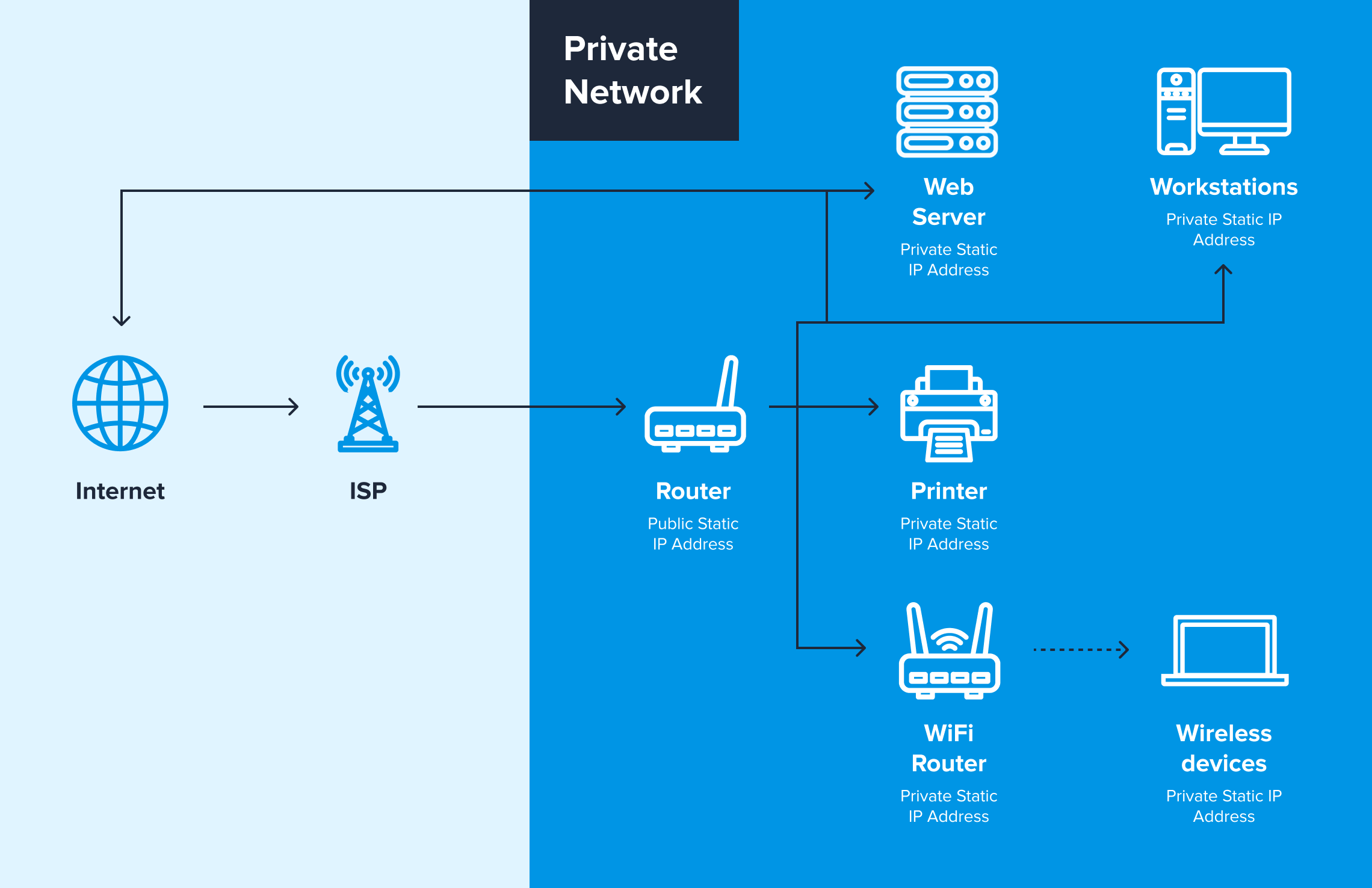 Internet is accessed through the connection provided by the Internet Service Provider (ISP). The router has a static public IP address that is shared by all the devices connected to the private network, such as printers, workstations, web servers, WiFi routers, and wireless devices.