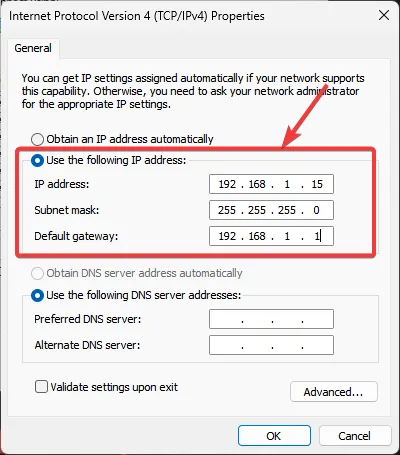 From here, double click on "Internet Protocol Version 4 (TCP/IPv4)" and select "Use the following IP address.”