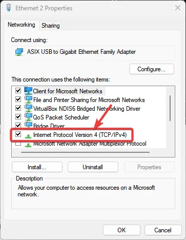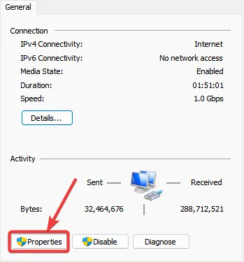 From here, select your active network connection, which could be WiFi or Ethernet. I will choose the Ethernet option. Click on the “Properties” button.