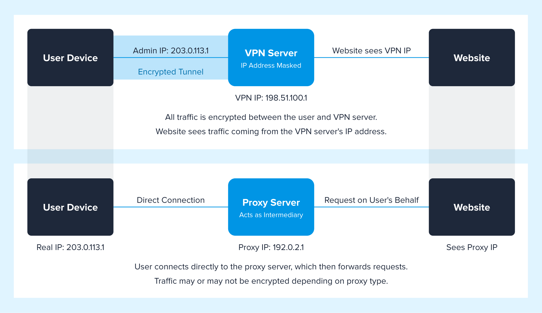 The key difference between a VPN and a proxy is encryption. While both hidden IPs route traffic through a remote server, only a VPN encrypts your data, making it unreadable to unauthorized users and offering stronger privacy and security compared to a proxy.