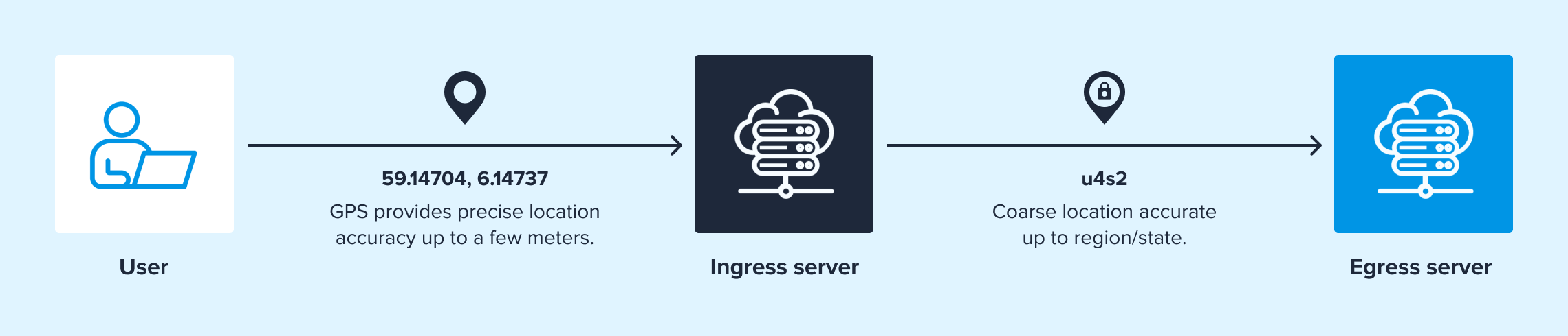 When a relay user connects and presents the previously determined geohash, the closest matching IP address is selected. Servers see the IP address of the second server that corresponds to the original user IP address's location without obtaining information that may be used to identify the specific user.