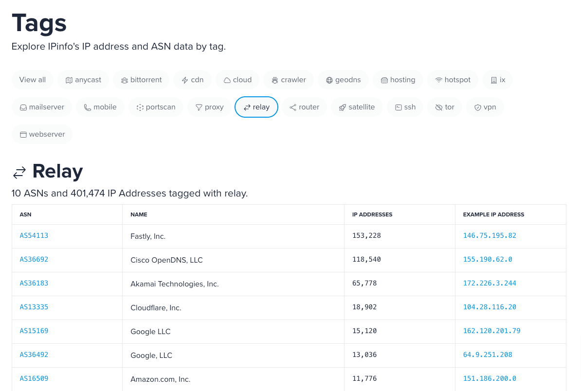 You can explore the relay IPs from our IP metadata tags page.